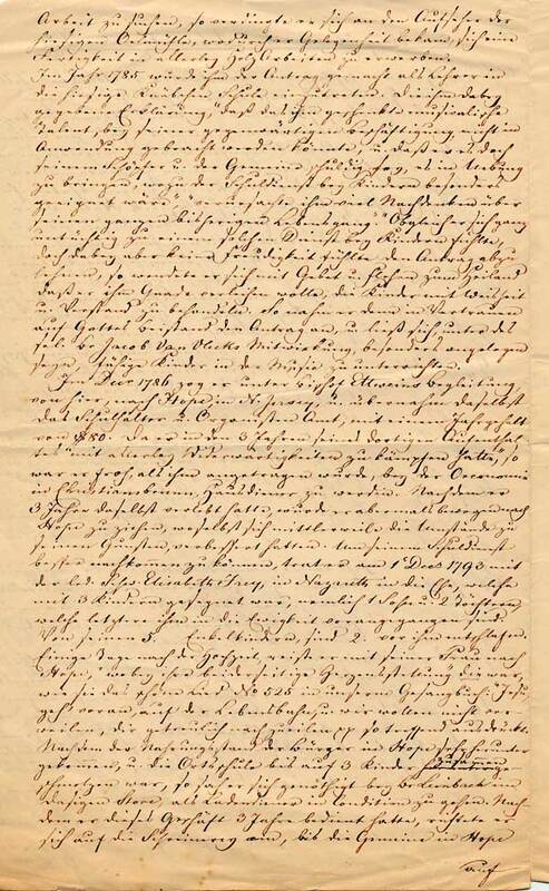 In December 1786, he moved from here in the company of Bishop Ettwein, to Hope, in New Jersey, and there took over the position of school keeper and organist, with a yearly salary of $80. Because in the three years of his stay here, "he had to fight against all kinds of unpleasantness," he was pleased when it was offered to him that he become House Servant for the Oeconomy in Christiansbrunn. After he had spent three years there, he was prompted to move to Hope once again, where meanwhile conditions had improved in his favor. In order to better fulfill his school duties, he entered into marriage with the Single Sister Elisabeth Frey on December 1, 1793 in Nazareth, which marriage was blessed with three children: one son and two daughters. These latter preceded him into eternity. Of his five grandchildren, two passed away before him. A few days after the wedding, he traveled with his wife to Hope, "where their shared wish," was that, as the beautiful song No. 525 in our hymnal so aptly expresses, "Jesus, go ahead on the way of life, and we will not delay, to hurry after You faithfully." After the standard of living for the residents of Hope fell very low, and the school there declined to three children altogether, he saw it as necessary to go into the shop there as a storekeeper, along side Br. Leinbach. After he served this business for three years, he established himself in carpentry until the Gemeine in Hope was closed, and on May 1, 1808, he moved here with his family, where he sought his living in the beginning with carpentry and later with instrument-making. In 1811, he was offered the position of organist, which he fulfilled with punctuality and faithfulness until his final sickness, that is, thirty-three years. He also served in that capacity in the town boy's school for many years.