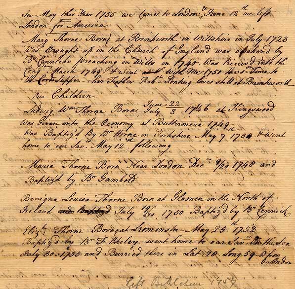 [Thorne, his wife and two surviving children reached Bethlehem in 1755. He left Bethlehem in 1757.] ;