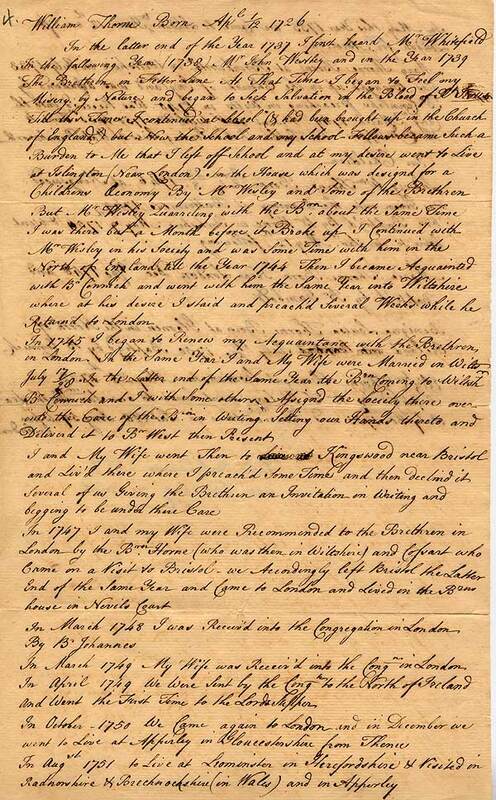 William Thorne born April 12 1726. In the latter end of the year 1737 I first heard Mr. Whitefield. In the following year (1738) Mr. John Wesley and in the year 1739 The Brethren in Fetter Lane. At that time I began to feel my misery by nature and began to seek salvation in the blood of dear [?] Jesus. Till this time I continued at school (I had been brought up in the Church of England) but now the school and my school fellows became such a burden to me that I left off school and at my desire went to live at Islington (near London). In the house which was designed for a children's oconomy by Mr. Wesley and some of the Brethren but Mr. Wesley quarreling with the Brethren about the same time I was there but a month before the broke up. I continued with Mr. Wesley in his society and was some time with him in the north of England till the year 1744. Then I became acquainted with Br. Connick and went with him the same year into Wiltshire where at his desire I staid and preached several weeks while he returned to London.