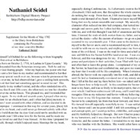 The memoir is written by Nathaniel Seidel himself up to his arrival in Bethlehem in Pennsylvania. It is continued by another brother or sister who had access to his travel diaries. Seidel recounts his childhood in Germany and the awakening he experienced at the age of 14. He rededicated himself to God at the age of 17, making a pact with his Savior. In 1739, he arrived in Herrnhut and went on to Herrnhag. In 1742, he answered a call to Bethlehem where he became the Elder of the Single Brethren. The rest of his biography recounts his many journeys among the Indians, the different settlements in North America, Europe, South America, and the West Indies. Throughout his life, he kept extensive travel diaries. He was ordained to multiple positions within the Brethren and became Bishop in 1758. The narrative accounts for his last years, his increased weakness, and his death in 1782.