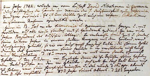 I was born in the year 1690 on October 3rd in Weinheim on the mountain road in electoral Palatinate, where my parents had fled because the city of Franckenthal, where they otherwise lived, had been burned by the French. My dear parents sent me to school and church regularly. In my 9th year I lost my mother and in my 14th [I lost] my father. In 1704 I came to Heidelberg and was apprenticed to a turner. At that time I look for a good stirring of my heart. In 1709 I set out as an itinerant [journeyman], fell into vain company, and lost my innocence. To my shame I must confess that I became rather reckless and where things were wildest that’s where I most enjoyed being; this lasted for about three years. Then my dear Savior began to work in my heart so that I became anxious and afraid in the company of my jolly friends, and his chastising mercy worked so powerfully in me that when I came home I remembered everything that I had done over the course of the day. Then I often dissolved in many tears and promised to make it better without thinking that I unfortunately could do nothing until finally, through the Savior’s grace, his word came to me: Without me you can do nothing, The I began to pray with tears that He would have mercy on me and forgive me all my sins and I resolved to improve myself. I also ttried more and more to free myself from my vain companions. In 1714 I allowed my friends to convince me to become a master craftsman in Heidelberg. In February 1715 I married my dear wife, who went to the Savior here on February 7, 1758. We were married 43 years and had 9 children, of whom 5 daughters are still alive and from them we have 38 grandchildren, of whom 7 have gone to the Savior, and 16 great-grandchildren. I hope and pray that all of them may progress toward the Savior and that none of them will be lost. In the year 1717 I moved from Heidelberg to Franckenthal until in 1726 I moved to Pennsylvania with my wife and 3 children. I lived for 20 years in Germantown. In 1738 I became acquainted with the dear Br. Spangenberg when he was living with Wiegner in Skippack, since we traveled there for a visit every 4 weeks. The blessed H[einrich] Antes, Stiefel, J. A. Gruber, I, and others from Germantown had many blessed hours together with each other. In 1742, when the dear Blessed Disciple (Count Zinzendorff) came to Pennsylvania, I became acquainted with him and other people [and] my heart quickly felt a tender inclination to him and I came to love them heartily. When I heard the blessed Count preach in the church in Germantown for the first time it was this way in my heart: "Yes! That is indeed the true and only basis of blessedness: Jesus Christ and his merits and suffering. No other foundation can one lay. It is only through his death that life is earned." And from then on the Brethren were the dearest visitors in my house, and when hate and bitterness against the Brethren began to grow in the country I received my own portion in abundance. Then my Reformed religious relatives, among who I had served as a preacher for more than 16 years, began now to torment me somewhat until they expelled me on Sunday, February 9, 1744. The congregation’s watchword for that day was: "The Jerusalem above is mother to us all. In the East and the West it is for those who are pressed down, still always something for the best from the congregation." I did not know it [the watchword], however, until I came to Bethlehem but thereafter I knew in my heart that I belonged in the congregation. I asked the Savior to see to it that I received grace and to bring me to the congregation. He heard my plea and in early 1746 I received permission to move to Bethlehem which, to my great joy, occurred on September 13th. "Now!" I thought, "I will live for the dear Lord alone and through his grace I will be productive and blessed and thus he will keep me until my end." Thus far [what] the blessed [brother wrote himself].