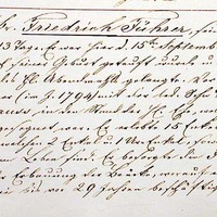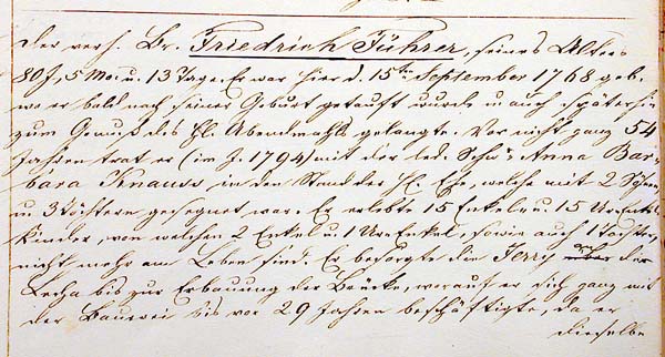 The Married Br. Friedrich Führer [Fuehrer], aged 80 years, 5 months, and 13 days. He was born here on September 15, 1768, where he was baptized soon after his birth and later received [the privilege of] enjoying the Holy Communion. Not quite 54 years ago (in the year 1794) he entered into the state of Holy Marriage with the Single Sr. Anna Barbara Knauss, which marriage was blessed with 2 sons and 3 daughters. He had 15 grandchildren and 15 great-grandchildren, of whom 2 grandchildren and 1 grandchild, as well as one daughter, are no longer living. He took care of the ferry on ["over" was written and then stricken out] the Lehigh until the bridge was built, whereupon he occupied himself entirely with farming until 29 years ago, when he gave the business over to his son Joseph, with whom he has lived uninterrupted since that time. About 15 years ago he had the misfortune to fall under a loaded wagon and break a leg. This was a difficult time of testing for him, since he was laid up for 8 weeks. Since this accident he has been lame, although he could nonetheless continue with his accustomed activities. A cold which he caught about 5 weeks ago caused an unusually heavy cough which produced ["caused" was written and then crossed out] severe back pains and required him to lay himself down. After he had been confined to bed for about 5 days it became clear that his end was drawing near. A few hours before it [came], he declared himself ready to depart and be with Christ. Shortly after the blessing of the LORD and the congregation for a blessed completion was imparted to him, he passed away at the age of 80 years, 5 months, and 13 days.