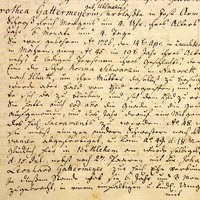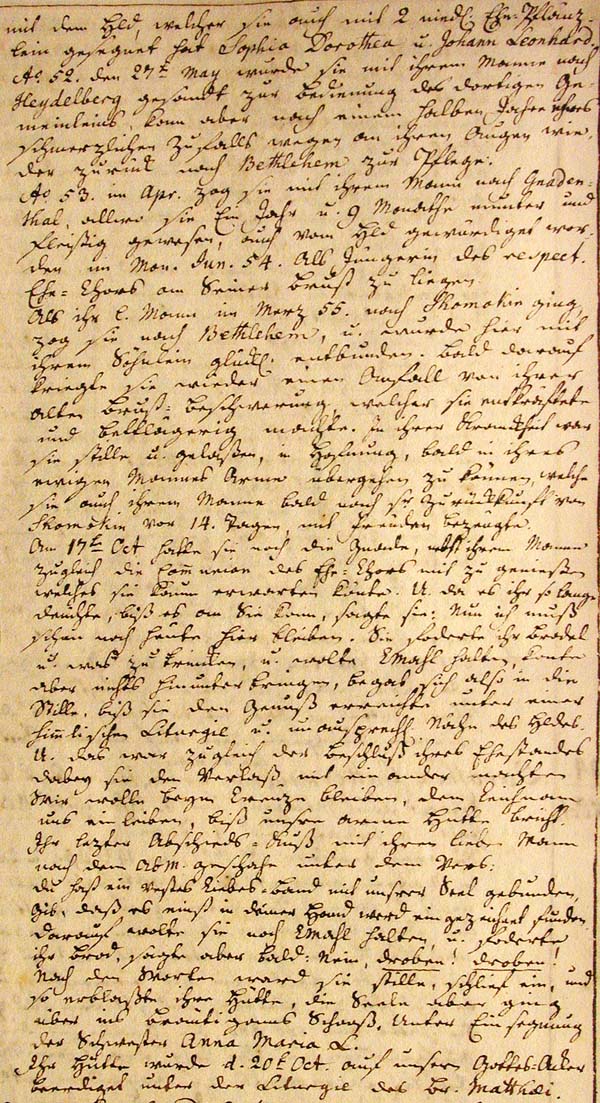 Dorothy Gattermeyer, born Uhlmann, died in Jesus’ arms and lap at 4 o’clock this morning at the age of 29 years, 6 months, and 4 days. She was born in the year 1726 on April 14th in Zauchenthal in Moravia. In the year 45, when she was 19 years old, she accompanied 2 single persons of her sex, one of whom was Sr. Rosina Schwarz, now of Nazareth, to Herrnhut in order to visit her mother there. She was, however, soon drawn to the Savior and resolved herself to remain there and to surrender herself to the Savior. In the same year she had the grace to be received into the congregation and the following year to become a participant in the Holy Sacrament. In the year 48 she prepared to depart for Pennsylvania along with several other sisters and arrived safely here in Bethlehem on the 18th of May in the year 49. On July 15th of the same year she was united in holy marriage with Br. Leonhard Gattermeyer [in a ceremony] along with 27 other couples. In this estate she remained for 6 years and 3 months in a simple and child-like walk with the Savior in which also was blessed with two dear little marriage-seedlings, Sophia Dorothea and Johann Leonhard.