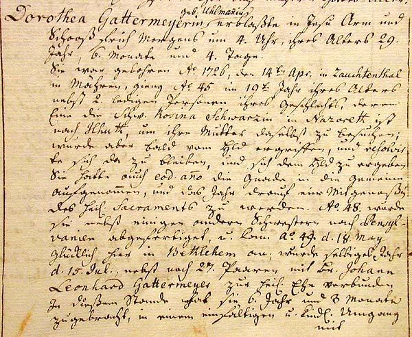 This is the notification in the church register of the death of Dorothy Gattermeyer, which occurred in Bethlehem, Pennsylvania, in 1755. It includes a biography.