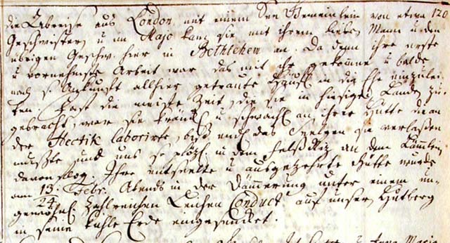 In the years 1737-1738, until Easter 1739, she stayed with her husband in Jena, where he was sent with our dearest heart Christian Renatus for the service of the learned and the salvation of the same in the university. In 1739, she became an eldress in the Gemeine in Herrnhaag. She was with the Pilgrim-Gemeine in Geneva in 1741; after her return she was with her husband in Marienborn (where they helped initiate the marriages of the groups destined for Pennsylvania in 1741 and 1743), until in 1744 she was once again was installed as eldress of Herrnhaag. She moved there in 1745, where she remained with her husband for two years. In 1747 and 1748, she was with the Pilgrim-Gemeine in Hennersdorf, at the time that the royal commission was held there. From there she began her journey to Pennsylvania, via Herrnhaag, Zeist, and London. Shortly before her departure from London she was declared "Mother of Pennsylvania" by the Pilgrim-Gemeine. The embarkation from London occurred in February 1749, with a Sea-Congregation of some 120 Brethren, and in May she came here to Bethlehem with her dear husband and the remaining Brethren. Here, her first and principal work then was to introduce into marriage the little group who came with her, and they were married soon after their arrival. Almost all the time that she spent in this land she was weak and sickly in her body, which suffered from consumption, until finally the soul had to leave her and us, and suddenly flew to the cleft** of the Little Lamb. Her soul-less and exhausted body was taken to our Hutberg at dusk on the evening of 13/24 February, amongst an unusually numerous company, and lowered into the cool earth.
