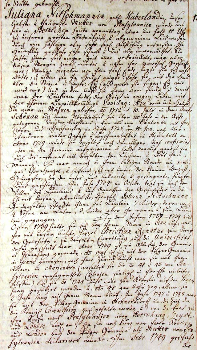 Juliana Nitschmannin, born Haberland, our dearest and most true Mother of Pennsylvania, was torn from us in a sudden but very blessed death at about ten-thirty this morning here in Bethlehem, to our greatest sadness and general regret. Her flight home occurred quite quickly, and was, for us, very unexpected. She had been ailing for some time, but this morning she appeared to be well and went about her usual business. Just a few minutes before her blessed end she lay on her bed. As she bent her head, she ran her hand over her brow and said "Ey," (as if she wanted to say: "Ey, what’s becoming of me?"). With that she let her arm fall. The body was dead and the soul in eternal life, with the lovely reception-Loosung: "Hail! Come in the House!"