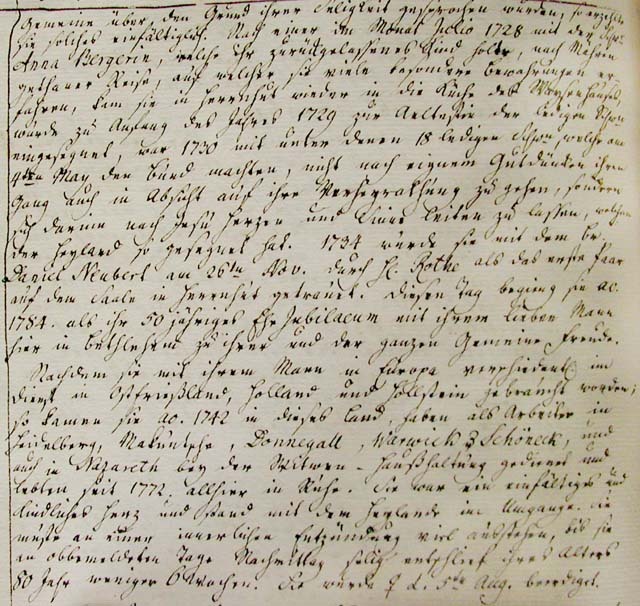She was born on September 15, 1705 in Cunewald, in Moravia. Her father was Tobias Hauer, a linen weaver and a secret lover of the evangelical truth. Christian David held meetings in his house. She was charged for this, and had to perform four weeks of hard labor, alongside thirty other souls, and then afterwards was forced into service in the public house. There she was for a half year, which was 1726; eight days before Christmas, the blessed Br. Piesch came from Herrnhut to lead her out. She had prayed to God in the stillness for her rescue. Three days before the new year she left with him in deep snow and cold winter weather, and came safely to Herrnhut on January 14. There, she lived through both the difficulties and the blessings that were experienced in the early days of Herrnhut. She took part in and celebrated with many blessings the 13th and the 27th of days of August 1727, and was a member of the hourly-prayer group. When the Bands or societies were established, she was assigned with holding the first Single Sisters’ community. While she served in Berthelsdorf, she achieved forgiveness for her sins and received mercy, and when the single women were spoken to over the grounds for their salvation, she told her story simply. After a trip to Moravia in July 1728, with Anna Berger who was fetching a child whom she had left behind, where she [Rosina] experienced many special protections, she came again to Herrnhut, in the kitchen of the Orphans’ House. She was blessed as an eldress of the Single Sisters in the beginning of 1729. She was among the eighteen Single Sisters who, on May 4, 1730, made a bond not to follow their own discretion in the matter of their marriages, but to give themselves to Jesus’ heart and His guidance, which agreement the Savior has so blessed. On November 26, 1734 she was married to Daniel Neubert by Herr Rothe*; the first marriage performed in the Herrnhut Saal. On that date in 1784 she celebrated here in Bethlehem her fiftieth wedding anniversary with her dear husband, to her and the whole GemeineÕs joy.