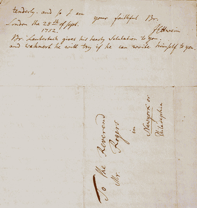 I can’t express how rejoiced I have been to hear that you on your voyage to Pensilvania [sic]have been so well, and that your preaching in New York had such blessing and applause. I love you tenderly and think very often on my dear Rogers, the Lord bless you and your traveling and preaching beyond all measure. I and my Nette [Johannetta] are since your departure again in our old station in Fetterlane, chearful, happy and in the wound of our Saviour heavenly content. The 18th of Sept. my Nette was delivered of a fine charming boy, almost as fine as your Tom altho’ I have not seen him, yet I know he is a charming fellow; this my little son was the same day in the general meeting baptized and called Christian. Will you be his God-Father, it will be a great blessing for the son and a great love and honour to Father and Mother. Now I am here in Westminster on the point to go with the single Srs. on board, and so I am in haste and must conclude with two hearty kisses and salutations. I love you very much, much, much and astonishing tenderly and so I am your faithful Br.
