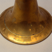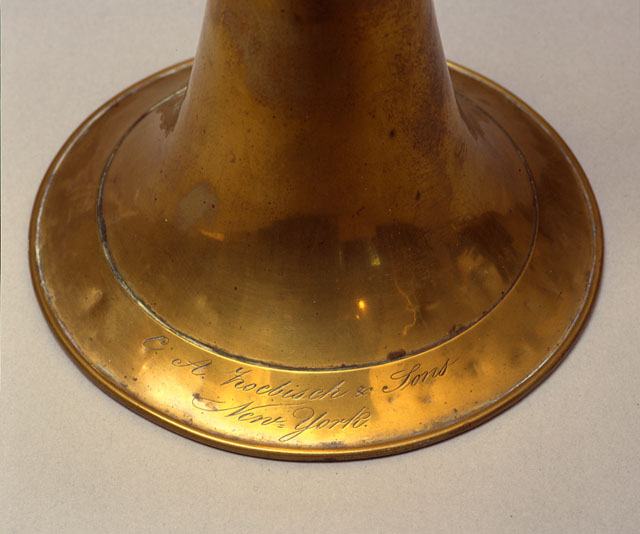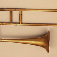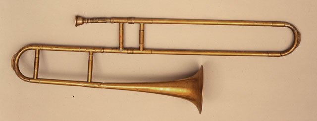Made of brass, 31 1⁄2” long,with 5” bell. Slide trombone, F, mouthpiece included. From the collection of the Moravian Historical Society, Nazareth, Pennsylvania.