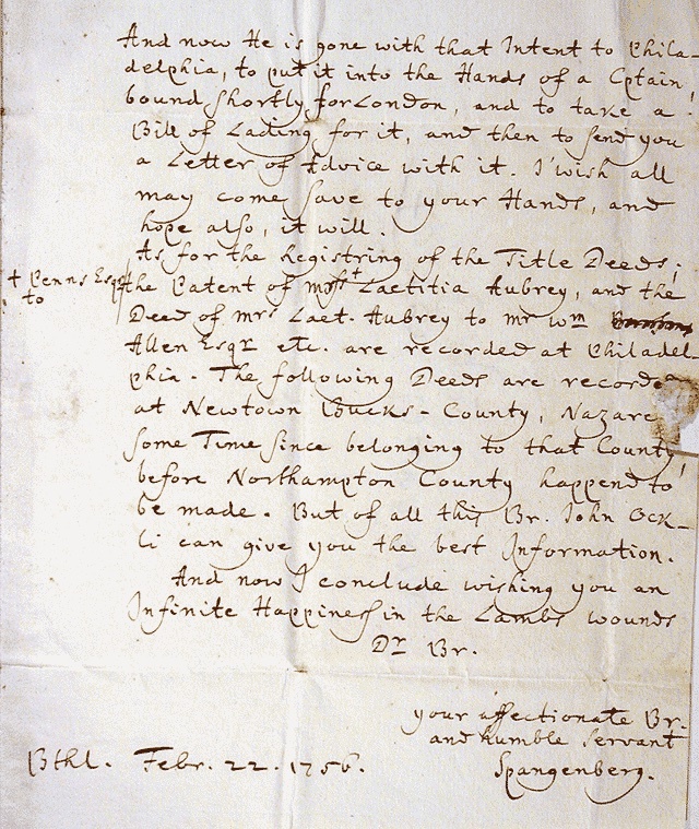 As for the registering of the Title Deeds; & Penns. Esqr.to the Patent of Mrss. Laetitia Aubrey, and the Deed of Mrs. Laet. Aubrey to Mr. Wm. Allen Esqr. Etc. are recorded at Philadelphia. The following Deeds are recorded at Newtown Bucks Count, Nazareth some time since belonging to the County before Northampton County happened to be made. But of all this Br. John Ockli can give you the best information.