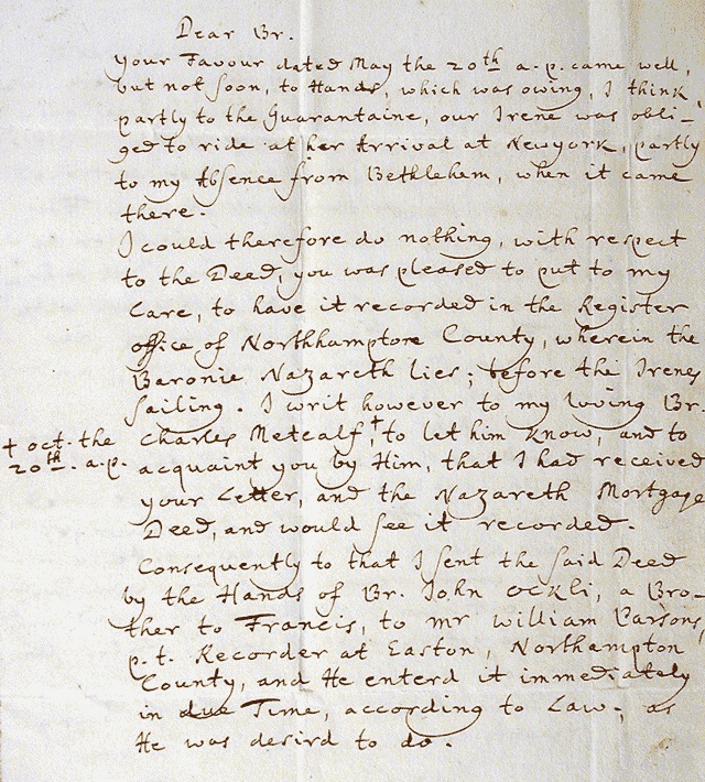 I could therefore do nothing with respect to the Deed, you was pleased to put to my care, to have it recorded in the Register office of Northhampton County, wherein the Baronie Nazareth lies; before the Irenes sailing. I writ however to my loving Br. [margin note] & Oct. the 20th a.p. [end margin note] Charles Metcalf, & to let him know, and to acquaint you by him, that I had received your letter, and the Nazareth Mortgage Deed, and would see it recorded.