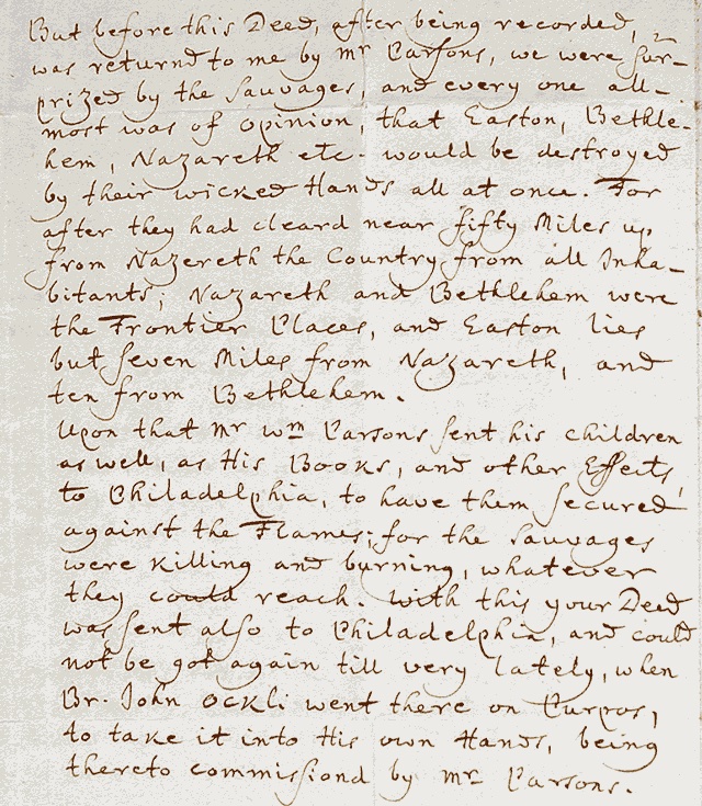 But before this Deed, after being recorded was returned to me by Mr. Parsons, we were surprised by the Savages, and every one almost was of opinion, that Easton, Bethlehem, Nazareth etc. would be destroyed by their wicked hands all at once. For after they had cleared nearly fifty miles up from Nazareth the County from all inhabitants; Nazareth and Bethlehem were but seven miles from Nazareth and ten from Bethlehem.