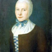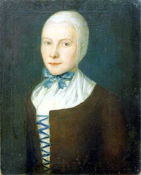 In this colored portrait of Johannetta Maria Kymbel Ettwein (1725-1789), she wears clothing typical of a Moravian woman during the General Economy, including a Schneppelhaube, or head covering, and blue ribbons that identify her as a Married Sister. Johannetta joined the Moravians in Germany in 1741 and married John Ettwein in 1746.