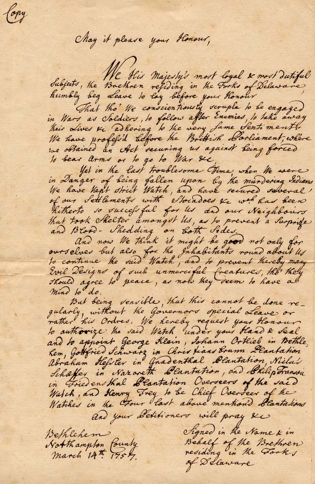 We His Majesty’s most loyal & most dutiful subjects, the Brethren residing in the Forks of Delaware, humbly beg leave to lay before your Honour
