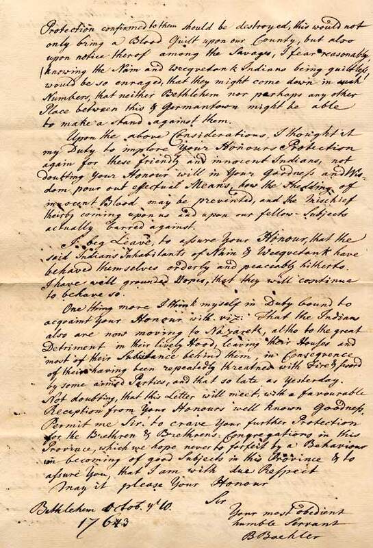 If now by heedless and enraged People these innocent Indians, who recently upon their Petition Your Honours Protection confirmed to them should be destroyed, this would not only bring a Blood Guilt upon our County, but also upon notice thereof among the Savages, I fear reasonably knowing the Nain and Wecquetank Indians being guiltless, would be so enraged that they might come down in such numbers, that neither Bethlehem nor perhaps any other Place between this & Germantown might be able to make a stand against them.