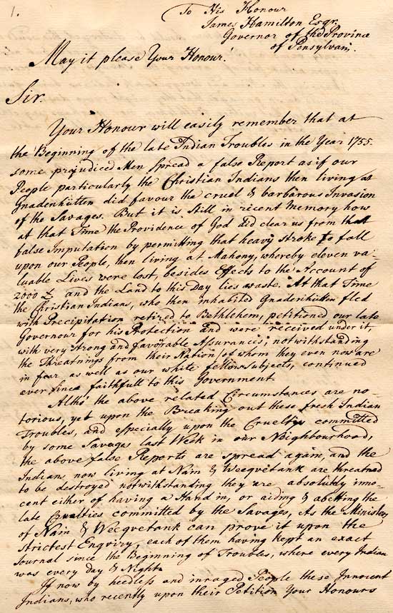 Your Honour will easily remember that at the beginning of the late Indian Troubles in the year 1755, some prejudiced men spread a false report as if our People particularly the Christian Indians then living at Gnadenhütten did favour the cruel and barbarous invasion of the Savages. But it is still in recent memory how at that time the Providence of God did clear us from that false imputation by permitting that heavy stroke to fall upon our People, then living at Mahony, whereby eleven valuable lives were lost, besides effects to the account of 2000£ and the land to this day lies waste. At that time the Christian Indians, who then inhabited Gnadenhütten fled with precipitation retired to Bethlehem, petitioned our late Governour for his Protection and were received under it, with very strong and favourable assurances; notwithstanding the threatenings from their Nation of whom they even now are in fear as well as our white fellow subjects, continued ever since faithfull to this Government.