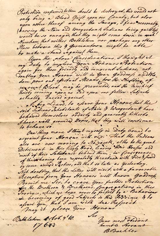 One thing more I think myself in Duty bound to acquaint Your Honour with viz: That the Indians also are now moving to Nazareth, although to the great Detriment in their lively hood, leaving their houses and most of their subsistence behind them, in consequence of their having been repeatedly threatened with fire & sword by some armed Parties, and that so late as yesterday. Not doubting that this letter will meet with a favourable reception from Your Honours well known goodness, permit me sir to crave your further Protection for the Brethren & Brethrens Congregations in this Province, which we hope never to forfeit by a Behaviour unbecoming of good Subjects in the Province & to assure You, that I am with due respect. May it please Your Honour