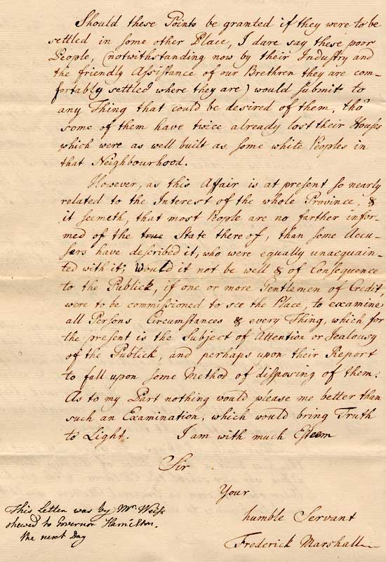 Should these Points be granted if they were to be settled in some other Place, I dare say these poor People, (notwithstanding now by their Industry and the friendly assistance of our Brethren they are comfortably settled where they are) would submit to any thing that could be desired of them, tho’ some of them have twice already lost their Houses which were as well built as some white Peoples in that Neighborhood.