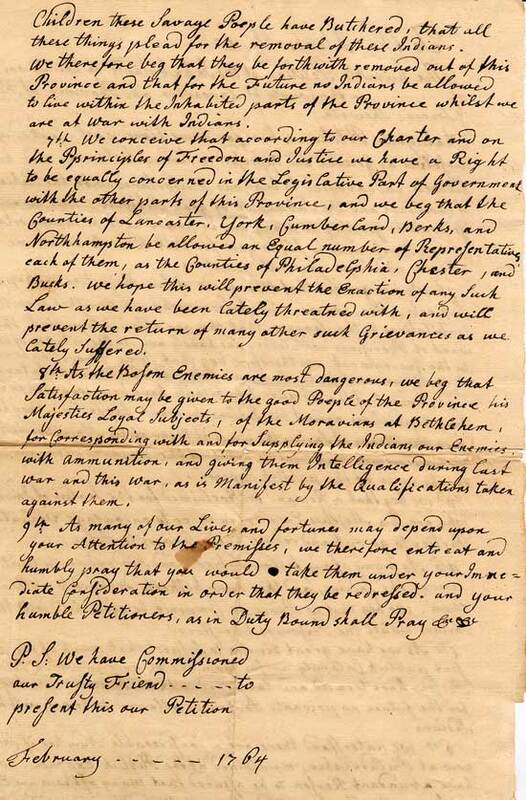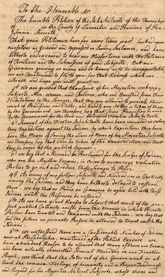 1764 Petition to Governor Penn by the Inhabitants of Certain Towns of Lancaster County