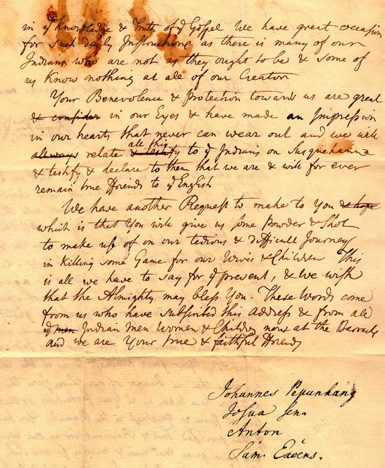 We have aonther Request to make of You & hope which is that You will give us some Powder & Shot to make use of on our tedious & difficult Journey in Killing some Game for our Wives & Children. This is all we have to say for the present, & we wish that the Almighty may bless You. These words come from us who have submited this address & from all the men Indian Men Women & Children now at the Barracks and we are Your true & faithful friends.