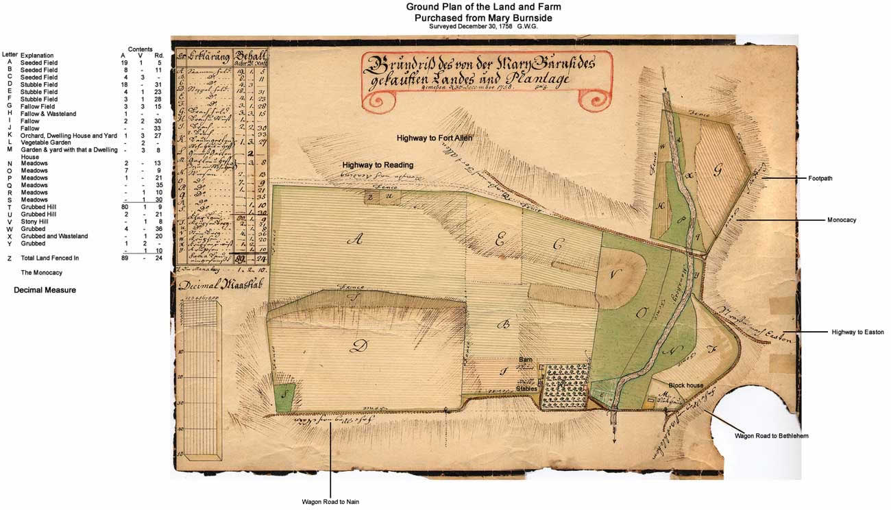 Ink and watercolor illustration of the ground plan of Burnside Plantation, prepared by Moravian surveyor, Georg Wenzeslaus Golkowsky in 1758.
