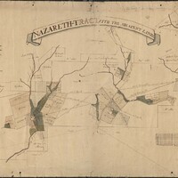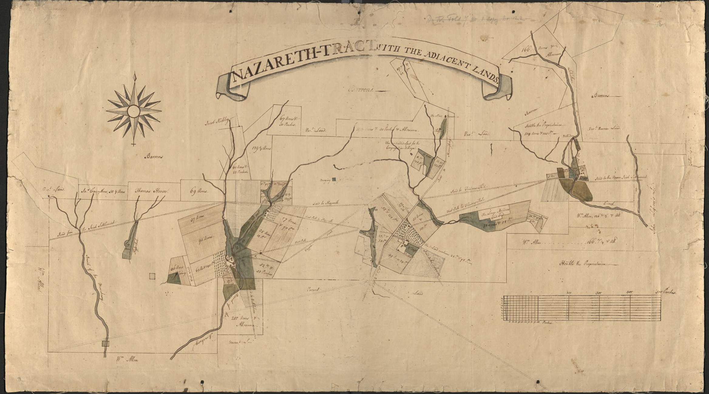 Ink and watercolor illustration of Nazareth Tract and adjacent lands created by Nicholas Garrison and Georg Wenzeslaus Golkowsky, c.1755.