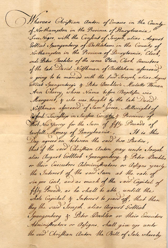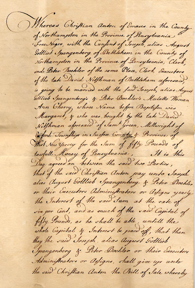 Whereas Christian Anton of Emaus in the County of Northampton in the Province of Pensylvania [sic] Free Negro, with the consent of Joseph, alias August Gottlieb Spangenberg of Bethlehem in the County of Northampton in the Province of Pensylvania, Clerk, and Peter Boehler of the same place, Clerk, Executors of the late David Nitschman of Bethlehem aforesaid, is going to be married with the said Joseph, alias August Gottlieb Spangenberg’s & Peter Boehler’s Mulatto Woman Ann Cherry, whose name before baptism was Margaret, & who was bought by the late David Nitschman aforesaid of Saint Green, Millwright of Oxford Township in Sussex County & Province of West New Jersey for the sum of fifty pounds of lawfull [sic] money of Pensylvania. It is this day agreed on between the said two parties, that if the said Christian Anton pay unto Joseph alias August Gottlieb Spangenberg & Peter Boehler or their Executors Administrators or Assigns yearly the interest of the said sum at the rate of six per cent, and as much of the said capital of fifty pounds, as he shall be able, untill [sic] the whole capital & interest be paid off, that then they the said Joseph, alias August Gottlieb Spangenberg & Peter Boehler or their Executors Administrators or Assigns, shall give up unto the said Christian Anton the Bill of Sale whereby the said Ann Cherry was bound to the said David Nitschman & that both the said Ann Cherry and her issue which shall then be born, be quite free.