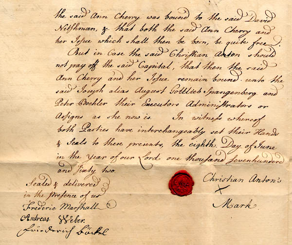 But in case the said Christian Anton should not pay off the said capital, that then the said Ann Cherry and her issue remain bound unto the said Joseph alias August Spangenberg and Peter Boehler their Executors Administrators or Assigns as she now is. In witness whereof both parties have interchangeably set their Hands & Seals to these presents, the eighth day of June in the year of our Lord one thousand seven hundred and sixty two.