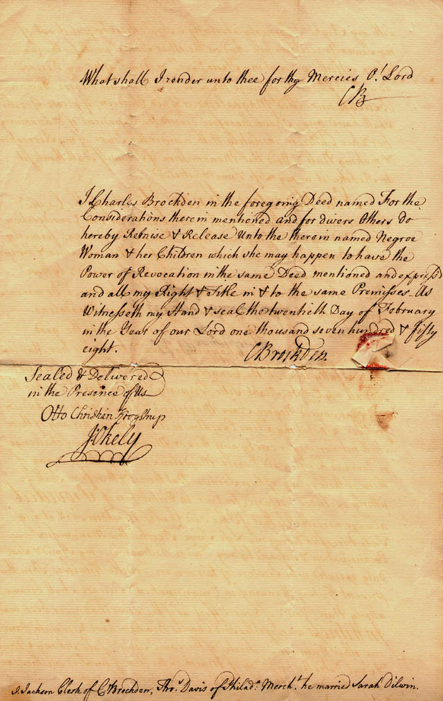 I Charles Brockden in the foregoing Deed named for the considerations therein mentioned and for divers [sic] others do hereby Remise and Release unto the herein named Negroe Woman & her Children which she may happen to have the Power of Revocation in the same Deed mentioned and express'd an all my Right & Title in & to the same premisses. As witnesseth my Hand & seal the twentieth day of Frebruary in the year of our Lord one thousand seven hundred & fifty eight.