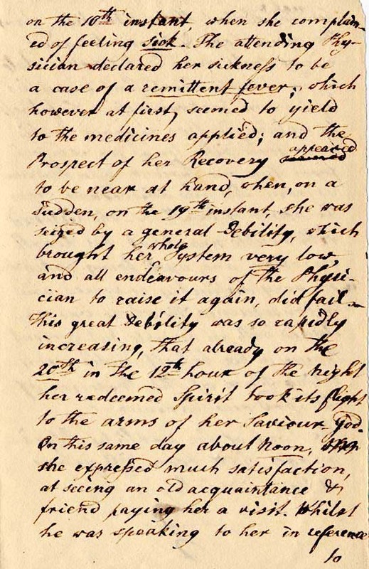 Excepting several attacks of the fever & ague, that was prevailing two summers at this place & in the neighbourhood, our Sr. was generally enjoyment & good health until on the 10th instant, when she complained of feeling sick. The attending physician declared her sickness to be a case of remittent fever; which however at first seemed to yield to the medicines applied; and the prospect of her recovery appeared to be near at hand, when, on a sudden, on the 19th instant, she was seized by a general debility, which brought her whole system very low, and all endeavors of the physician to rain it in, did fail. This great debility was so rapidly increasing , that already on the 20th in the 12th hour of the night her redeemed spirit took it flight to the arms of her Saviour God. ON this same day about noon, she expressed much satisfaction at seeing an old acquaintance & friend paying her a visit. Whilst he was speaking to her in reference to her weak & awful situation, about the divine love & mercy toward needy souls, and the desirable state of an humble heart, that conscious of her own backwardness & sinfulness by nature, in love resigned to this ever good will, longs for comfort, from him, our Saviour who redeemed us from sin and delivered us from the power of death & she listened with visible marks of her heart’s emotion and, upon being asked about it she very distinctly answered, and in consequence, the whole was concluded with an humble but fervent prayer in her behalf, under a consoling sense of the presence of the Lord, our Saviour.