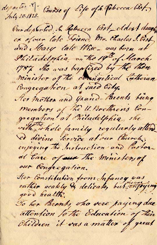 Our departed Sr. Rebecca Cist, oldest daughter of our late friend, Mr. Charles S. Cist and Mary late Wise – was born at Philadelphia on the 19th of March 1787. She was baptized by the then minister of the evangelical Lutheran Congregation of said city.