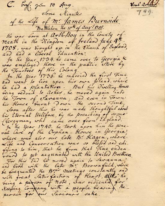 In the year 1740, he took upon him the general care of the Orphan-House in Georgia, where was also our late Br. [John] Hagen, whose life and conversation was so blessed and edifying to him, that he from that time endeavoured to get acquainted with the United Brethren.