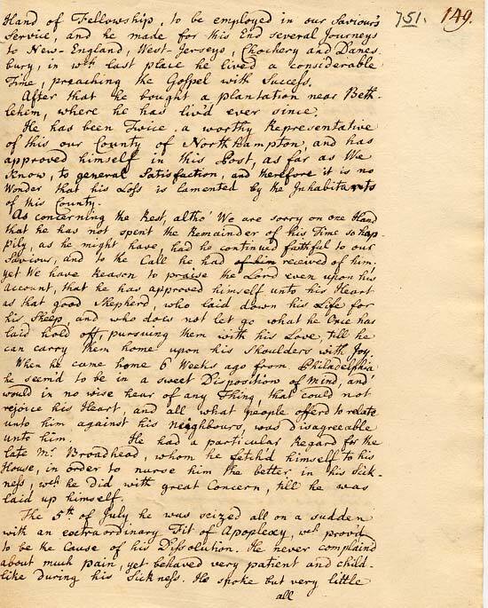 When he came home 6 weeks ago from Philadelphia, he seemed to be in a sweet disposition of mind, and would in not wise hear of any thing, that could not rejoice his heart, and all what people offered to relate unto him against his neighbours, was disagreeable unto him. He had a particular regard for the late Mr. Broadhead, whom he fetched himself to his house, in order to nurse him the better in his sickness, which he did with great concern, till he was laid up himself.
