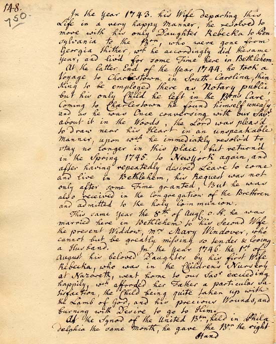 In the year 1743, his wife departing this life in a very happy manner, he resolved to move with his only daughter Rebecka to Pennsylvania to the Brethren, who were gone from Georgia thither, which he accordingly did the same year, and lived from some time here in Bethlehem.