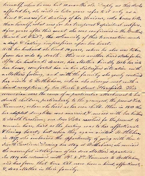 With her husband she lived 14 years, when he also was taken from her side by death. This was another hard stroke for her. After her husband's decease, her Mother kindly took her into her house, comforted her in her distressed situation with a Mother's feeling, and with the family she yearly continued her visits to Bethlehem, where she always met with a kind reception by her Uncle and Aunt Horsfield. This connexion was the cause of a particular attachment to her Aunt's children, particularly to the youngest, the present Sister Kummer, whom she loved as her own child. When in 1813 this her adopted daughter was married and moved with her husband to North Carolina, our dear Sister resolved for the present to remain her, hard as the parting was to her affectionate and loving heart; but when they again visited Bethlehem in 1817, she embraced the opportunity of going with them to North Carolina. During her stay at Bethabara, she received the mournful intelligence of her dear Mother's departure.
