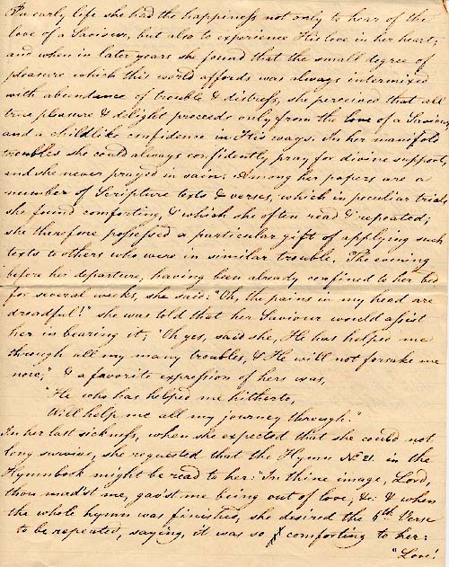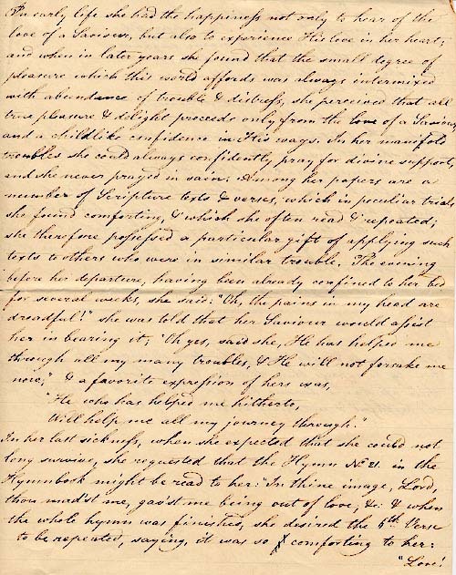 In her last sickness, when she expected that she could not long survive, she requested that the Hymn No. 21 in the Hymnbook might be read to her: "In thing image, Lord, though mad'st me, gav'st me being out of love; etc.: and when the whole hymn was finished, she desired the 6th Verse to be repeated, saying, it was so comforting to her: