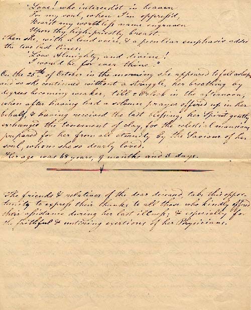 On the 25th of October in the morning she appeared to fall asleep, and so she continued without a struggle, her breathing by degrees becoming weaker, till 2 o'clock in the afternoon, when after having had a solemn prayer offered up in her behalf, and having received the last blessing, her Spirit gently exchanged the tenement of clay, for the celestial mansions prepared for her from all eternity by the Saviour of her soul, who she so dearly loved.