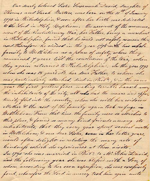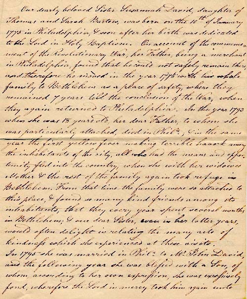 In 1795 she was married in Philadelphia with Mr. John David, and the following year she was blessed with a son, of whom, according to her own expression, she was excessively fond, wherefore the Lord in mercy took him again unto...Himself, when he was but 10 months old. Deeply as this stroke affected her, she could in later years refer to it only as a kind and merciful dealing of her Saviour, who knew better than herself, what was for her temporal and spiritual welfare. A few years after this event she was confirmed in the Brethren's Church at Philadelphia; the solemnity of this transaction made a deep and lasting impression upon her heart.