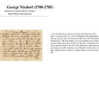 In this memoir, George Nixdorf describes his birth and childhood in Silesia. He was raised by a very pious mother and he remembers the awakening of the children of Silesia in 1708. Later in his life, he met Moravians (including Christian David) in a tavern where he was working. After a much troubled life, he arrived in Herrnhut in 1742. The following year, he and his wife traveled to Pennsylvania serving multiple congregations including Lancaster. The memoir was finished by another brother or sister who describes Nixdorf's unwavering faith and recounts his last years.