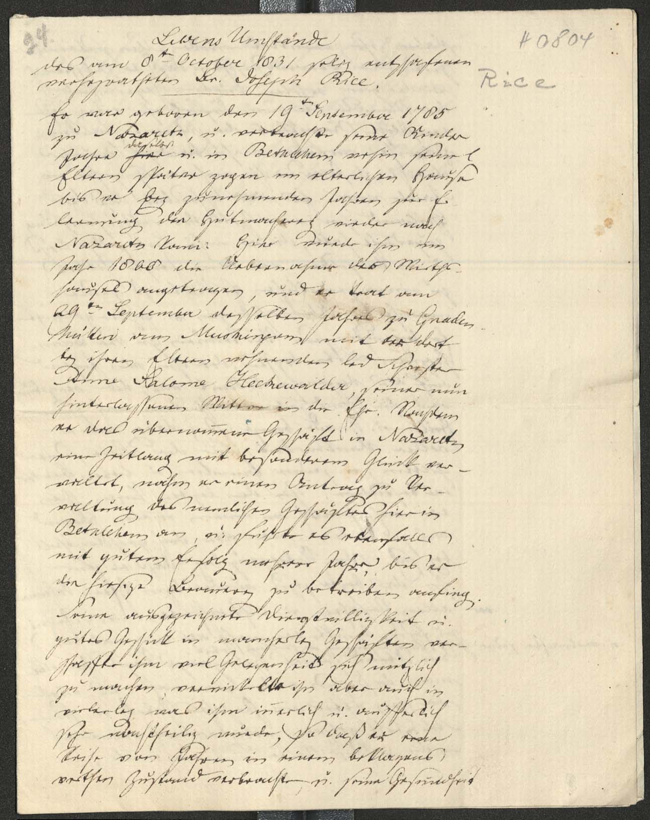 Lebens Umstände des am 8ten October 1831 selig entschlafenen verheyratheten Br. Joseph Rice Er war geboren den 19ten September 1785 zu Nazareth, u. verbrachte seine Kinder Jahren hier daselbst u. in Bethlehem wohin seine l. Eltern später zogen imelterlischen Hause bis er bey zunehmenden Jahren für Erlernung der Hutmacherey wieder nach Nazareth kam. Hier wurde ihm im Jahr 1808 der Uebernahme des Wirthshauses angetragen, und er trat am 29ten September desselben Jahres zu GnadenHütten am Muskingum mit der dort bey ihren Eltern wohnenden led. Schwester Anne Salome Heckewalder, seiner nun hinterlassenen Wittwe in der Ehe. Nachdemer das übernommene Geschäft in Nazareth eine Zeitlang mit besonderem Glück verwaltet, nahm er einen Antrag zu Verwaltung des nemlichen Geschäftes hier in Bethlehem an, uführte es ebenfalls mit gutem Erfolg meherer Jahre bis er die hiesige Brauerey zu betreiben anfing. Seine ausgezeichnete dienstwilligkeit ugutes Geschick in mancherley Geschäften verschafte ihm viel Gelegenheit sich nützlich zu machen, verwickelte ihn aber auch in vielerley was ihm innerlich u. ausserlich sehr nachtheilig wurde, so da ßereine Reihe von Jahren in einem beklagenswerthen Zustand verbrachte, u. seine Gesundheitdabey sehr zerrYttet wurde. Schon seit einige Zeit war vorauszusehen, da§ ersich schwerlich wieder ganz erholen wurde. Gegen Ende des Monats August befiel ihneine sehr ernstliche Kranckheit die sich mit starken Erbrechen anfing, u. ihn bald so herunter brachte, da§ er nicht mehr auszugehen in stande war. Es war offenbar da§ der Heiland ihm eine Zeit der Selbst Prufung zugedacht hatte, die er nicht unbenutzt lie§ u. in derselben von dem Geiste Gottes zu einer grYndlichen Erkenntni§ seiner mancherley Abweichungen u. Fehler gelangte Er bezeugte sein Vertrauen zu der Barmherzigen Liebe dessen, der ihm von Jugend auf als derjenige bekannt war, der vergebungsreich die Hand jedem reicht dem nach seiner HYlfe u. Gnade bange ist; dabey war er voller Dankbarkeit fYr die Liebe seiner Gattin, u. seiner Familie, u. lieben BrYder ins besondere. In den lezten Tagen schien er wahrscheinlich an einen inneren Brand viel zu leidenÑwar aber doch grs§ten theils bey sich. Der Ueberzeugung da§ es fYr ihn das beste seyn wYrde beym HErrn daheime vor allen Gefahren u. Schwachheiten in Sicherheit zu seyn, drYckte er mehr als einmal aus, u. verbrachte seine Zeit fast bestSndig in seligen Gebet. Am Abend seines Heimgangs Tages bemerkte man da§ sein Ende heran nahe. Es wYrde wie schon sftere ein herzliches Gebet an seinem Sterbebett gethan, wobey er noch vernemlich in der Schlu§ Worte mit einstimmte, u.er empfing sodann den Segen des HErrn zu seinen Heimfahrt bey vollem Bewu§tseyn, u. entschlief sodann gegen _ auf 12 Uhr im Beyseyn seiner gesammten Kinder u. Familie Seine Ehe war mit 3 Sshnen u. 3 Tschtern gesegnet, welche alle noch hier in Bethlehem sich befinden. Sein Alter hat er gebracht auf 46 Jahr u. 19. Tage.