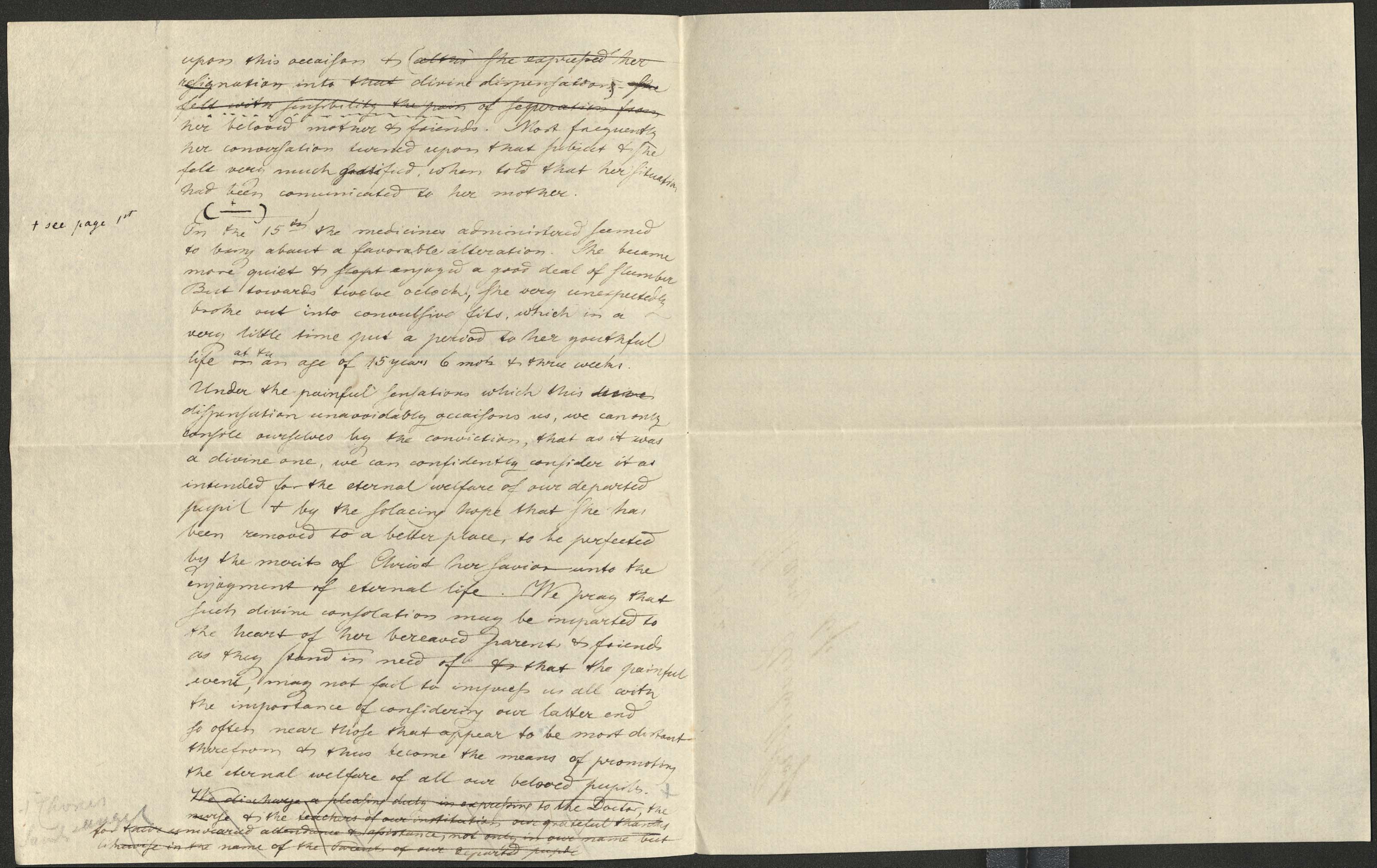 F However she continued very restless and in apparent pain during most of the night, in which she was very assiduously and affectionately attended by her teacher and NURSE, who did their best to alleviate her distresses. About the 9th of the month these symptoms subsided and we had every hope of her speedy recovery. But within a few days after, a relapse took place, and altho' even then no alarming symptoms of immediate danger occurred, it became evident that her illness had taken a different and more serious turn. She began to be impressed with the idea, and not possibly it might be the will of God to call her homeupon this occaison and (altho' she expected her resignation into divine dispensation, she felt with sensibility the of separation from her beloved mother and friends. Most frequently her conversation turned upon that subject and she felt very much gratified, when told that her situation had been communicated to her mother.
