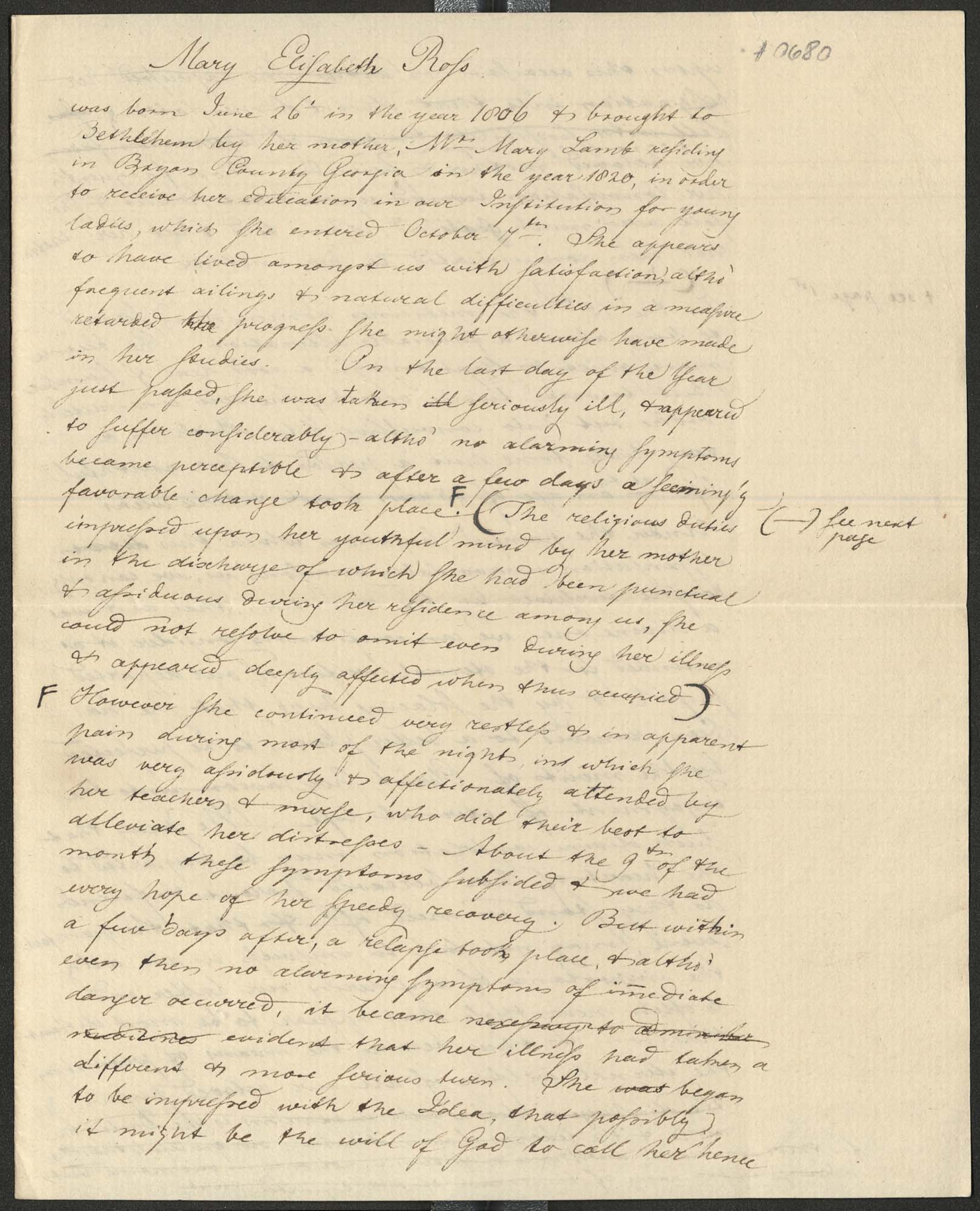 Mary Elizabeth Ross was born June 26th in the year 1806 and brought to Bethlehem by her mother, Mrs. Mary Lamb residing in Bayon County Georgia in the year 1820, in order to receive her education in our institution for young ladies, which she entered October 7th. She appears to have lived amongst us with satisfaction altho' frequent ailings and natural difficulties in a measure retarded progress she might otherwise have made in her studies. On the last day of the year just passed, she was taken seriously ill, and appeared to suffer considerably altho' no alarming symptoms became perceptible and after a few days a seemingly favorable change took place. F (The religious duties impressed upon her youthful mind by her mother in the discharge of which she had been punctual and assiduous during her residence among us, she could not resolve to omit even during her illness and appeared deeply affected when thus occupied.) (---) see next page [from right margin]