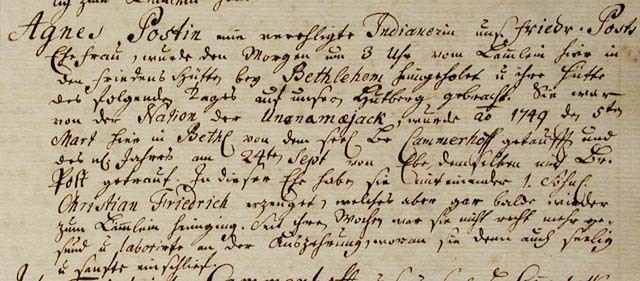 This is the death notification in the church register of Agnes Post (Postin), which occurred in Bethlehem, Pennsylvania, in 1751. The entry includes a very short biography.