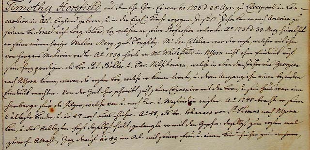 This is the death notification in the church register for Timothy Horsfield, which occurred in Bethlehem, Pennsylvania, in 1773. The entry also contains a biography.