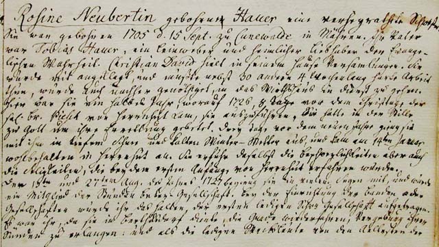 This is the death notification in the church register for Rosina Neubert (Neubertin), which occurred in Bethlehem, Pennsylvania, in 1785. The entry also contains a biography.