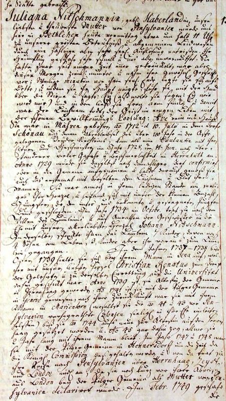 This is the death notification in the church register for Rachel Post, which occurred in Bethlehem, Pennsylvania, in 1747. The entry contains a biography.