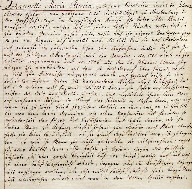 This is the notification in the church register of the death of Johannette Maria Ettwein, which occurred in Bethlehem, Pennsylvania, in 1789. The entry includes a short biography.