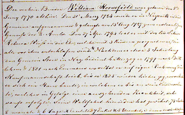 This is the death notification in the church register for William Horsfield, which occurred in Bethlehem, Pennsylvania, in 1845. The entry also includes a short biography.